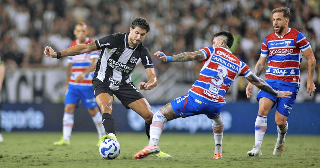 Apitou, parou… em vão. O clássico começou bastante disputado em meio ao espetáculo protagonizado pelas duas torcidas no Castelão, e foi justamente a partir das arquibancadas que surgiu o primeiro momento inusitado: Moisés, do Fortaleza, tentava arrancar pela ponta quando parou e olhou para Wilton Pereira Sampaio, imaginando que o juiz tivesse apitado. O problema é que o barulho veio da parte de fora do gramado, fato que gerou o reinício do embate com bola ao chão. O episódio voltou a ocorrer aos 15 minutos, desta vez quando Brítez tinha a posse.